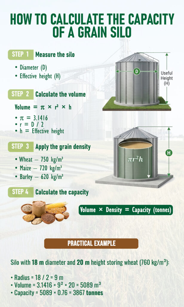 By multiplying the silo volume by the grain density, it is possible to estimate the storage capacity in tonnes.